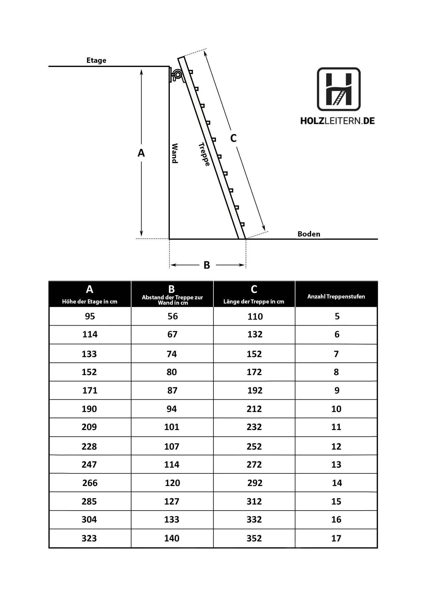 Die Buchentreppe bietet eine Lösung für Höhen von 104 cm (5 treden) tot 323 cm (17 treden). Die nachstehende Tabelle bietet einen Überblick über die verfügbaren Treppenlängen und gibt an, welche Treppengröße (Anzahl der Stufen) für die verschiedenen Senkrechthöhen empfohlen wird.