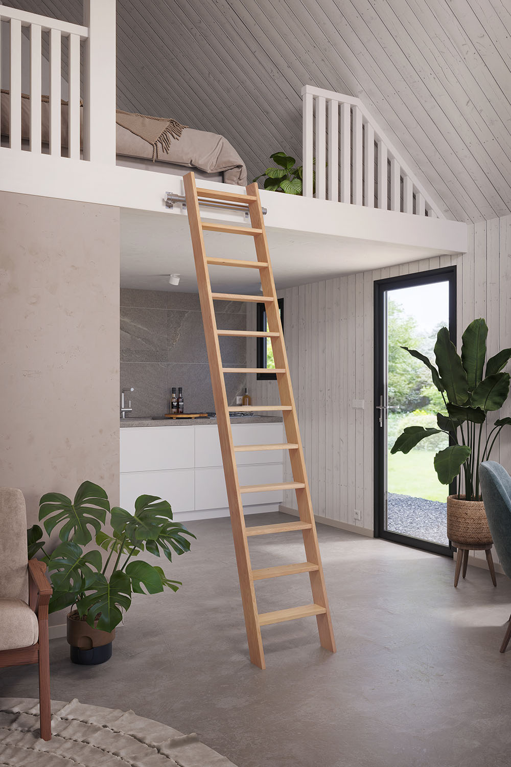 Die Treppe wird als komplettes Stück geliefert. Sie müssen es also nicht selbst bauen oder montieren. Die Treppe muss nur noch zusammengebaut werden, und Sie können wählen, ob Sie sie dauerhaft oder semi-permanent befestigen wollen. Bei der letztgenannten Option haben Sie die Möglichkeit, die Treppe nach der Installation zu verschieben, was mit Hilfe unseres Zubehörs möglich ist. Zubehör wie Befestigungshaken, Befestigungsstange und Handläufe können separat bestellt werden.