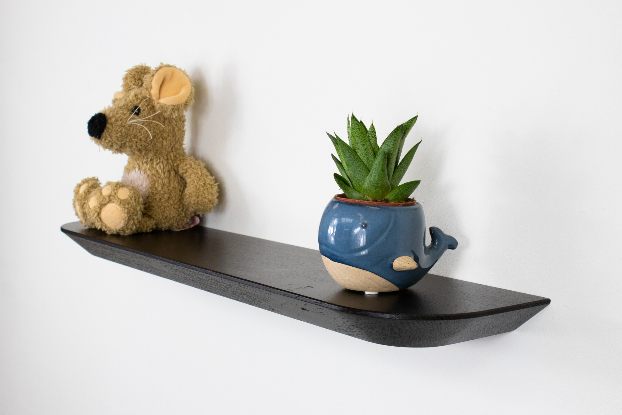 Das schwebende schwarze Wandregal ist schlicht lackiert. Der Lack sorgt dafür, dass das Eichenholz gut geschützt ist. Leicht zu reinigen und sauber zu halten.